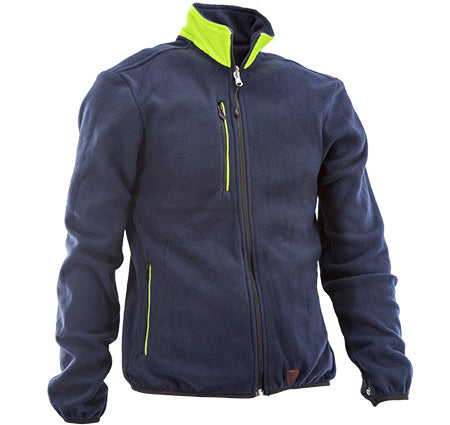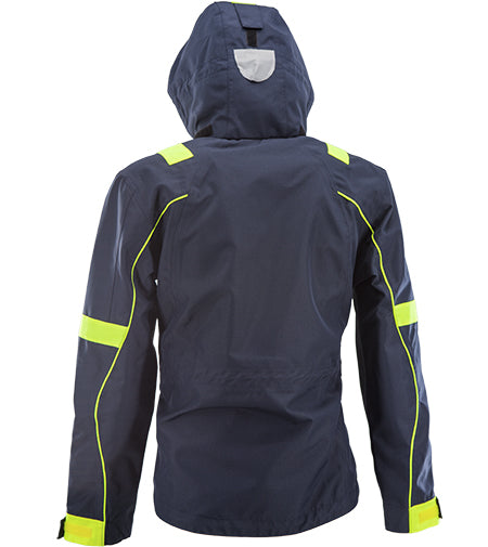 Inserti in tessuto giallo fluo su braccia e spalle con piping a contrasto.