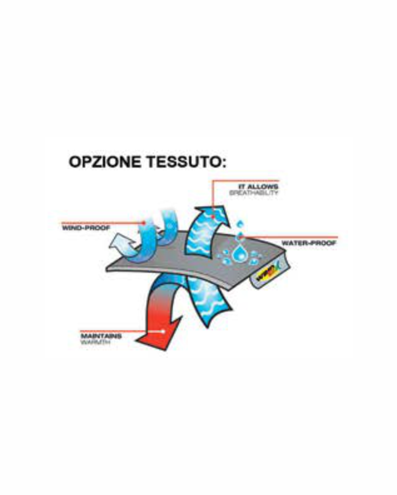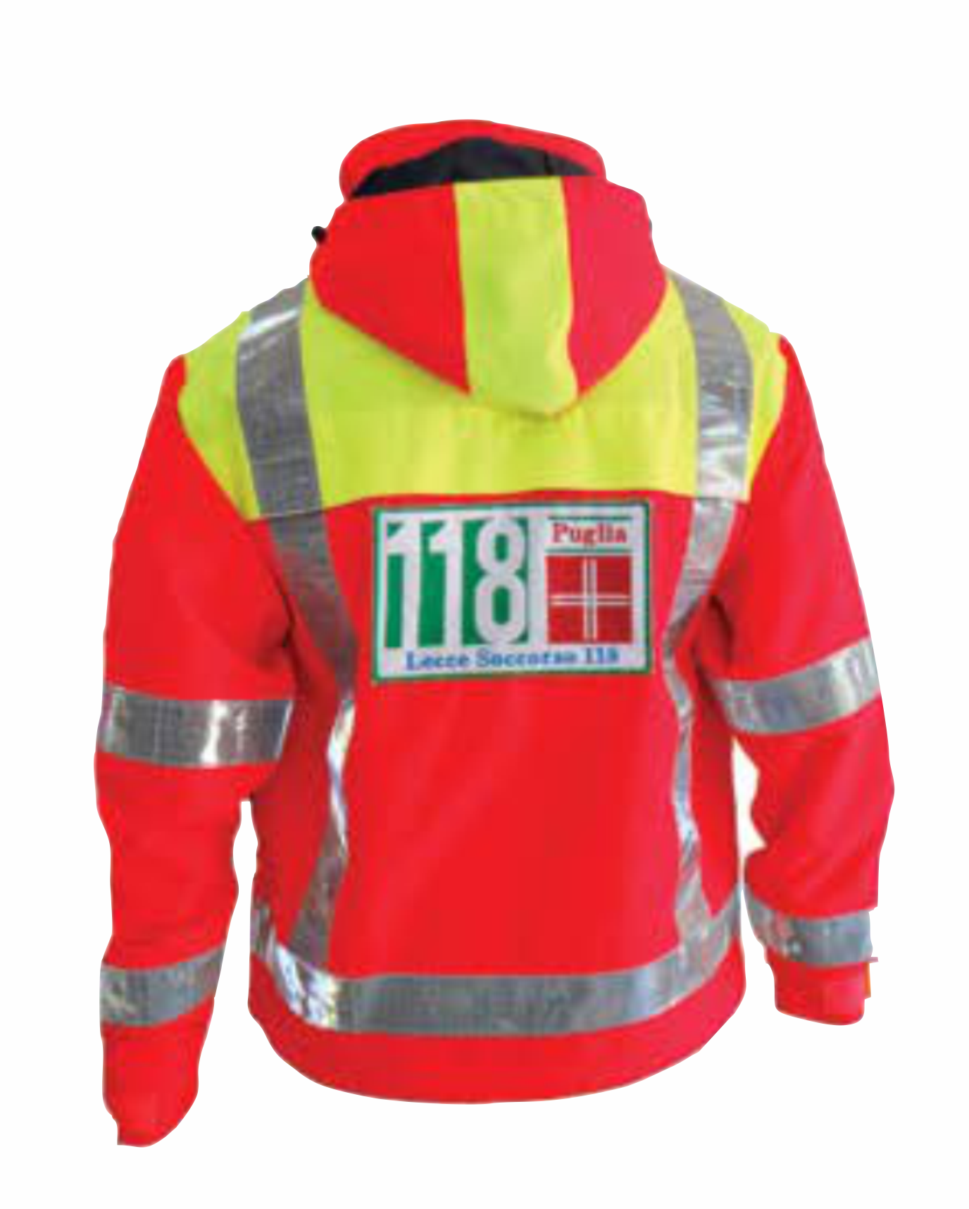 Tasca verticale chiusa da cerniera e sistema portaradio/cellulare sul petto sinistro. Cappuccio fisso regolabile a scomparsa nel collo. Regolazione dei polsi mediante alamaro velcrato. Banda rifrangente a tecnologia microprismatica.