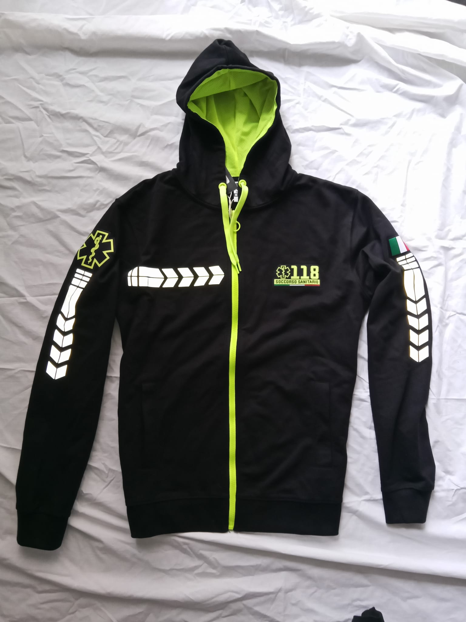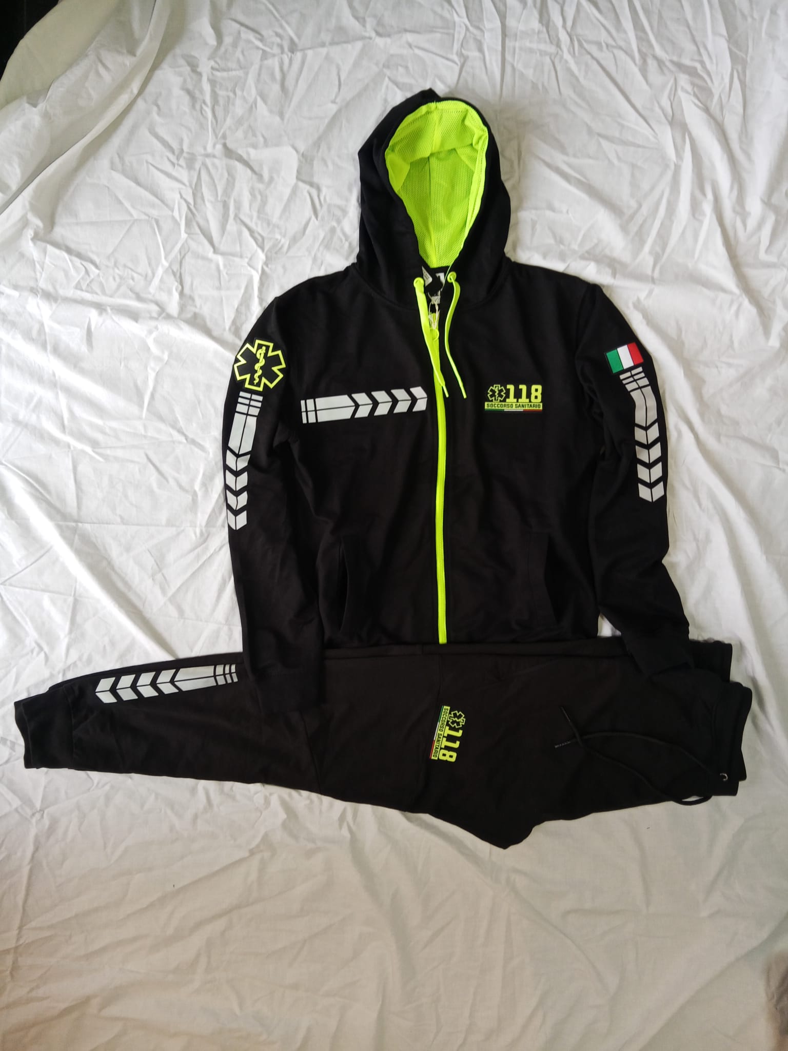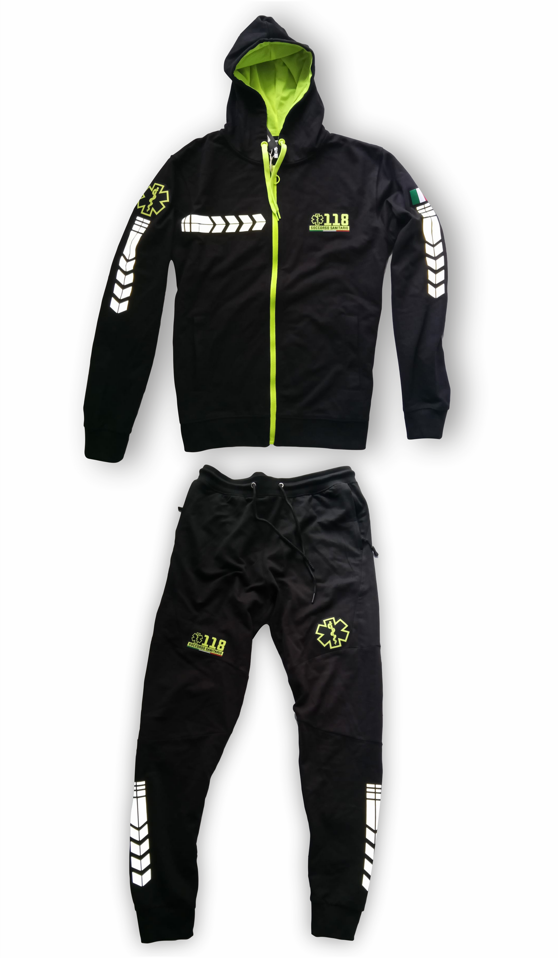 Tuta in french terry con particolari in colore fluorescente. La felpa ha la zip centrale con tiretto ad anello a contrasto in colore fluo. Il cappuccio è con fodera in tessuto poliestere microforato a contrasto in colore fluo, la coulisse e gli occhielli sono in metallo a contrasto colore fluo. Le maniche hanno i polsini e i girovita in costina 1x1. Due tasche anteriori con ampie cuciture a vista. Copri cuciture di rinforzate all'interno del collo.