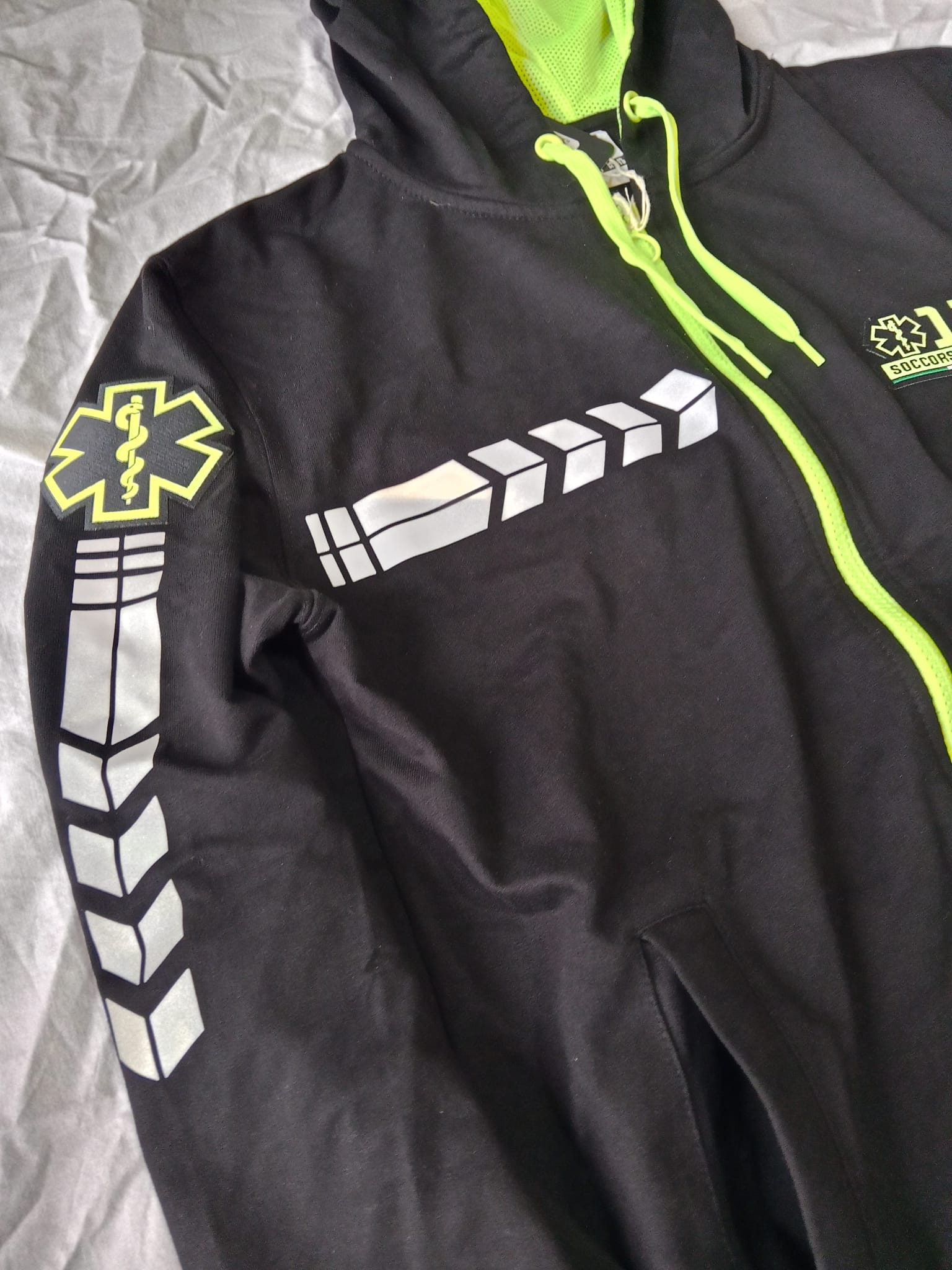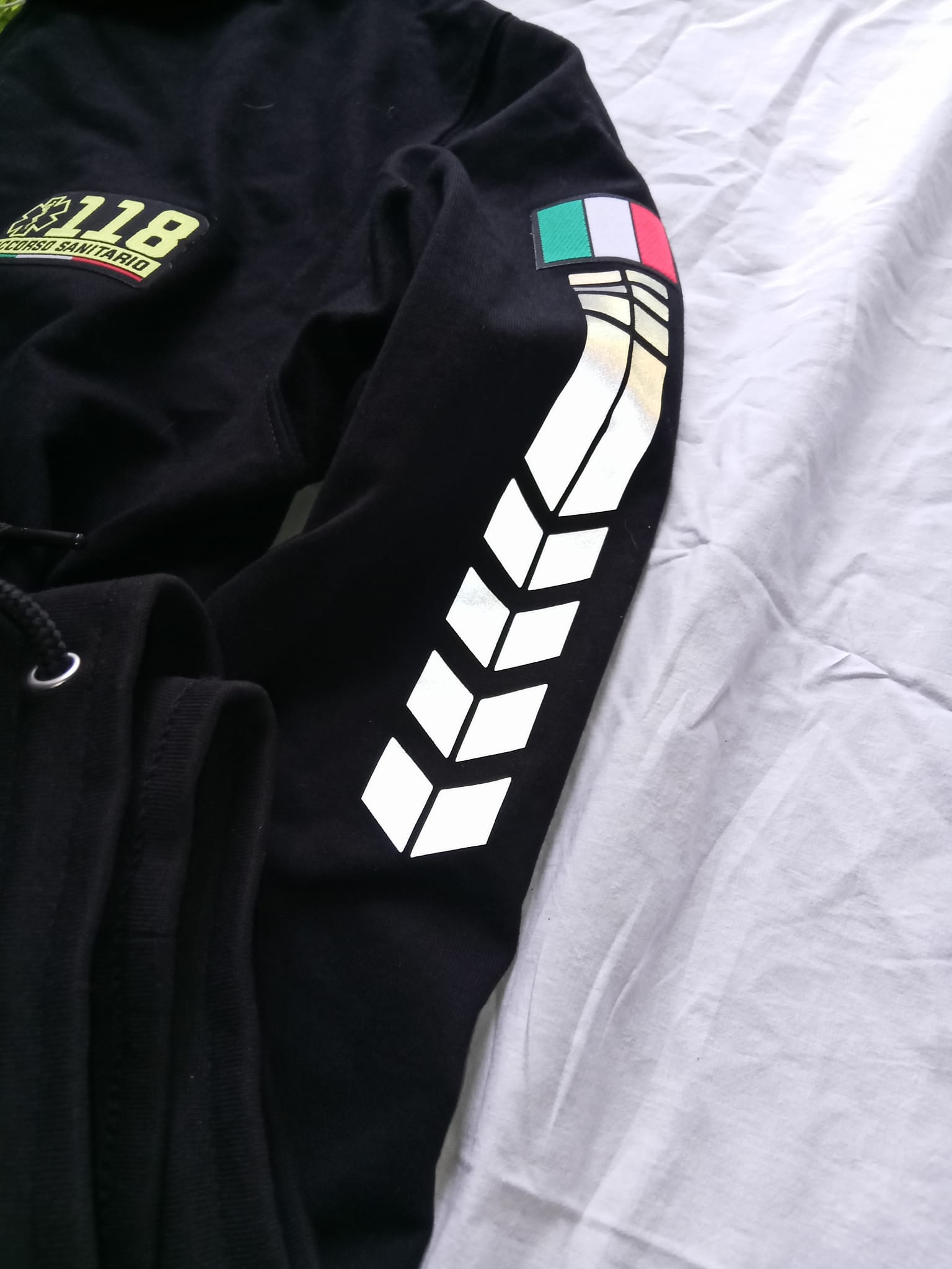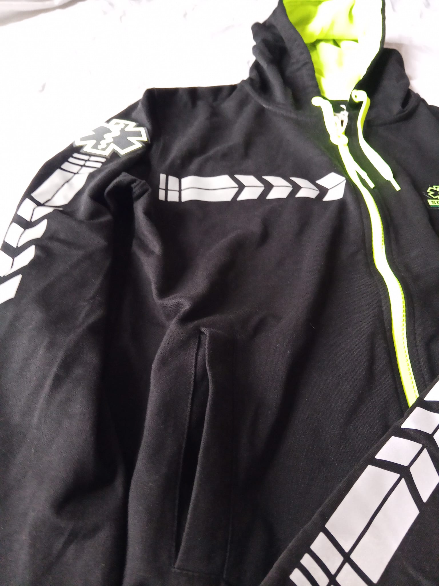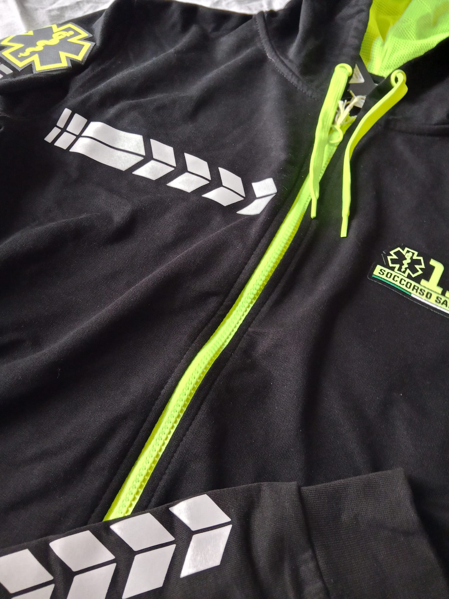 Tuta in french terry con particolari in colore fluorescente. La felpa ha la zip centrale con tiretto ad anello a contrasto in colore fluo. Il cappuccio è con fodera in tessuto poliestere microforato a contrasto in colore fluo, la coulisse e gli occhielli sono in metallo a contrasto colore fluo. Le maniche hanno i polsini e i girovita in costina 1x1. Due tasche anteriori con ampie cuciture a vista. Copri cuciture di rinforzate all'interno del collo.